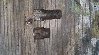 The part of the stud with the ridges is .618 and the swaged part is .640. The last picture shows the small size difference between the ridges area and the swaged area. If I would have pounded it out the other way, would it have enlarged the hole in the drum/hub to the point that my new lug would have spun in the hole? I don't know, because a lot of people seem to just pound them out the front?